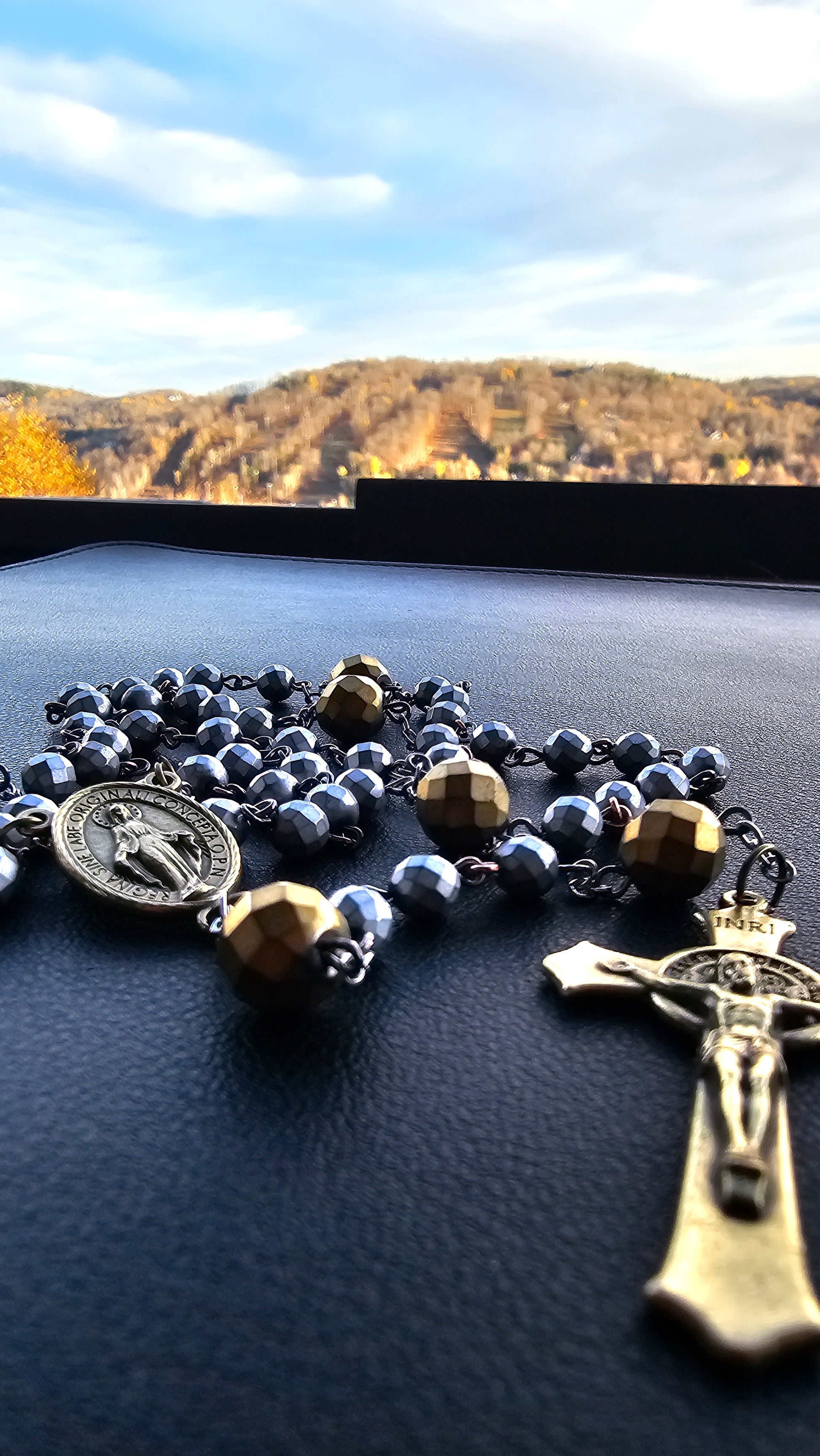 Handcrafted with care and reverence, this rosary carries a simple, timeless beauty. The faceted matte beads reflect light softly, creating a subtle shimmer that complements the warm, antiqued tones of the bronze metalwork.